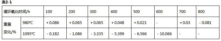 (1) Inconel 625抗氧化性能 :合金具有优良的抗高温氧化性能,高温下在空气介质中循环氧化后合金的重量变化见表2-1.