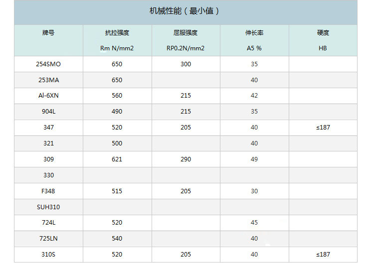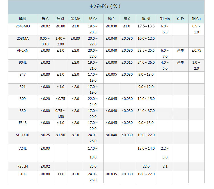 性酸如硫酸、醋酸、甲酸、磷酸中具有很好的耐蚀性,在中性含氯离子介质中具有很好的抗点蚀性,同时具有良好的抗缝隙腐蚀